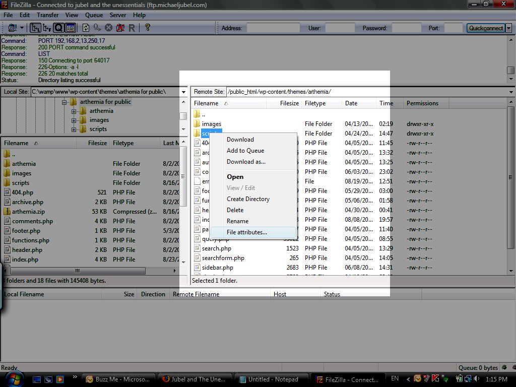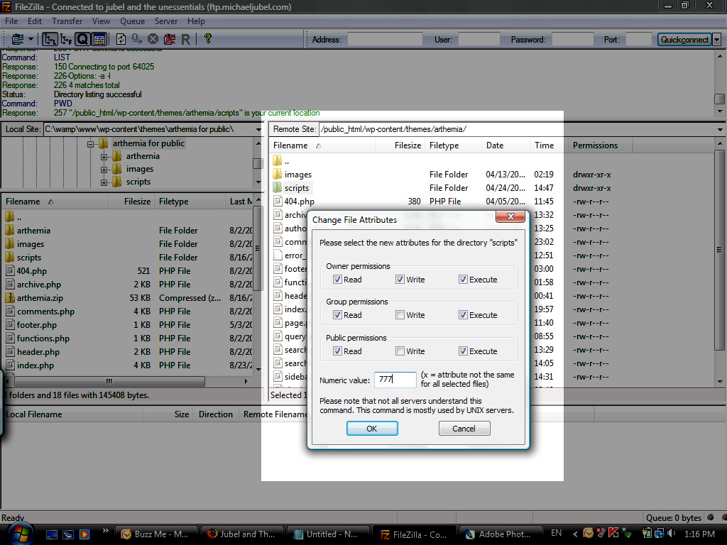 Upload and activate the Arthemia theme. Then, the first step is to make the scripts and cache folder writable. You can either try ‘777’ writable or ‘755’ writable. Some web hosting company prevent you making any folder ‘777’ writable due to some security reasons. But, I suggest you to try with ‘777’ writable first. I use FileZilla to do the FTP work because it is free and has a lot of features. To make the folders writable, simply right click the folder name and select ‘File Attributes’ and a dialog box will show up.