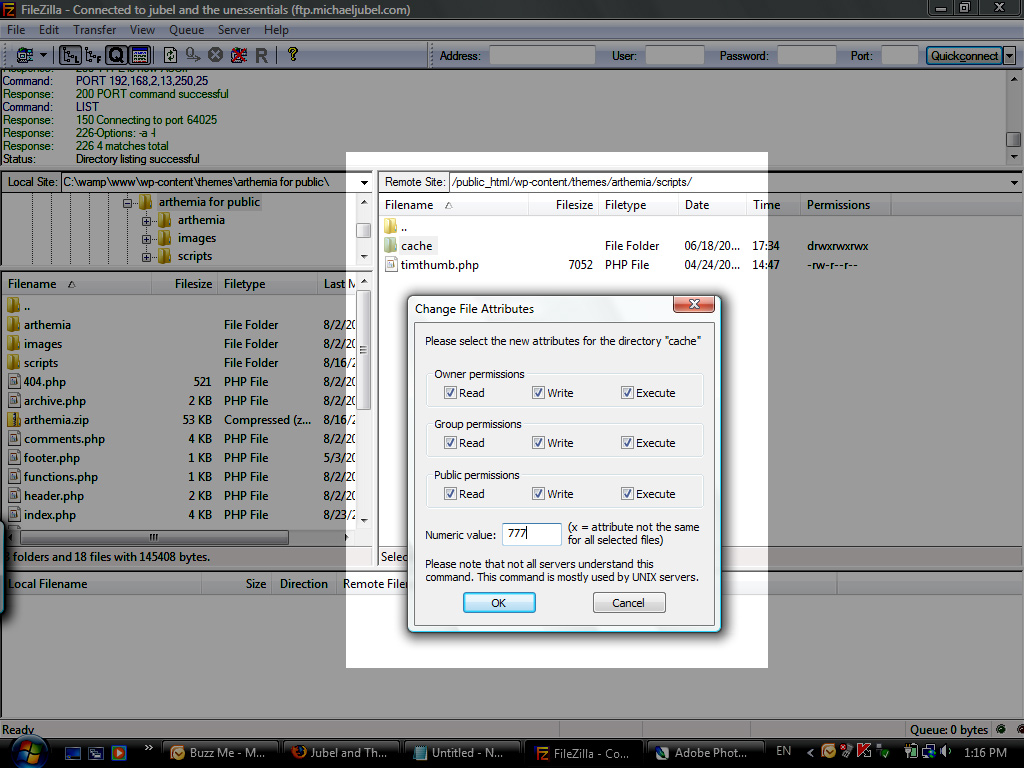 You can tick all the attributes there, consider it a finger exercise, or directly type 777 as the folder attribute. Do this to both scripts and cache folder.