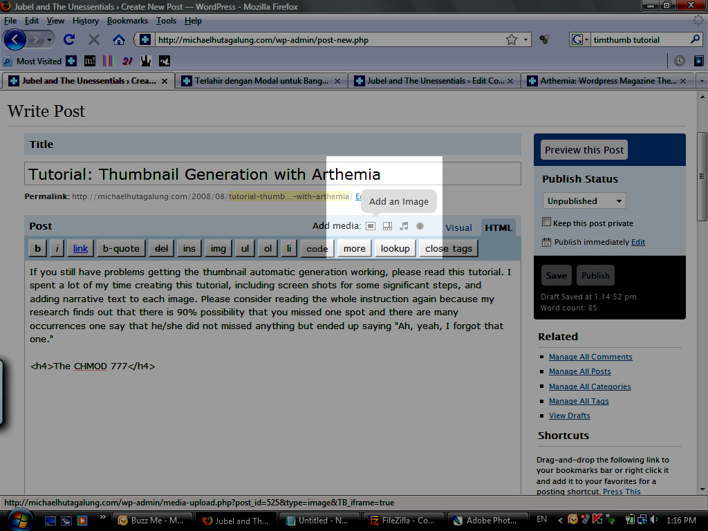 If you still have problems getting the thumbnail automatic generation working, please read this tutorial. I spent a lot of my time creating this tutorial, including screen shots for some significant steps, and adding narrative text to each image. Please consider reading the whole instruction again, again, and again because I found out that there is 90% possibility that you missed one spot and there are many occurrences one say that he/she did not missed anything but ended up saying “Ah, yeah, I forgot that one.” :D