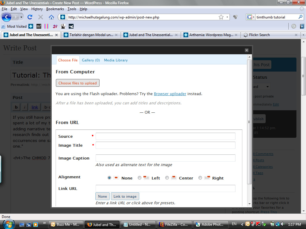 To upload image, you can use the built-in Add Image WP feature. In the post editing page, notice the Add media icons just below your post title and permalink. Click “Add Image” and an image uploading page will show up.