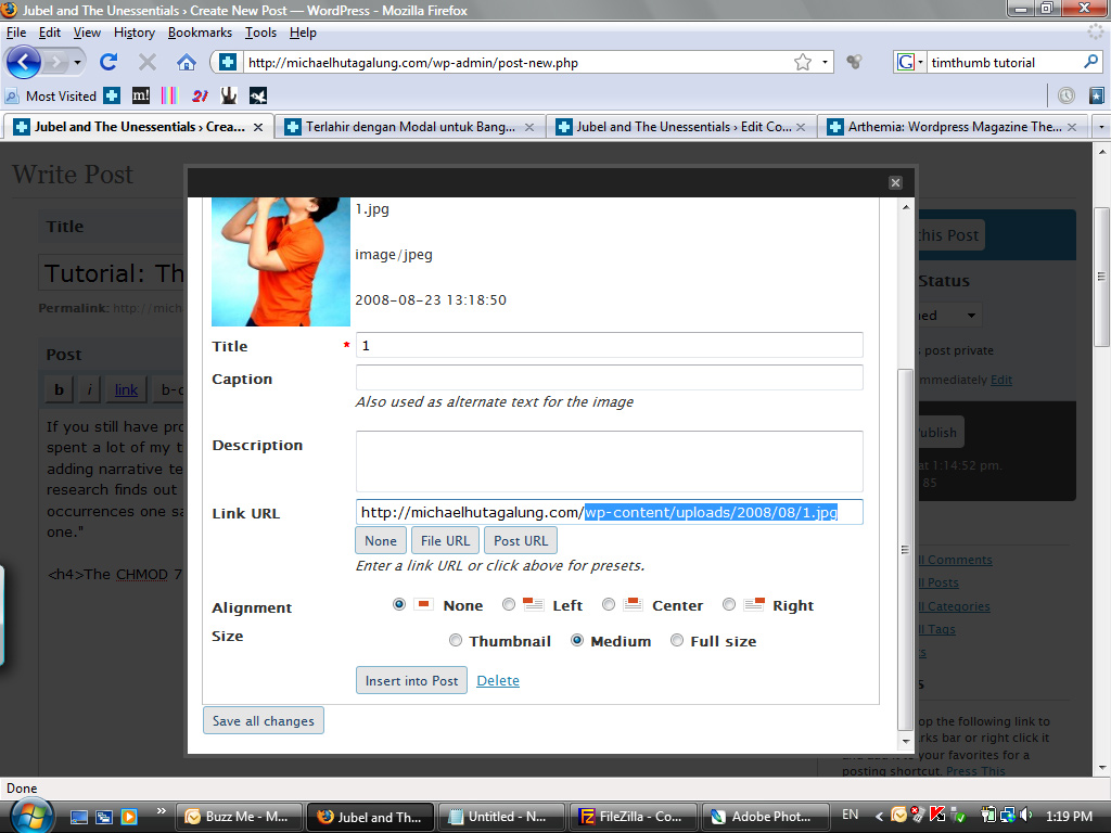 After the image is uploaded, you can see the image location from the ‘Link URL’ field. In this tutorial, it is: http://michaelhutagalung.com/wp-content/uploads/2008/08/1.jpg. Values may vary depending on your blog settings. One may have the time-structured folder while others may not. Copy that value but remember to get rid of your blog home page location. In my case, the final value will be wp-content/uploads/2008/08/1.jpg.