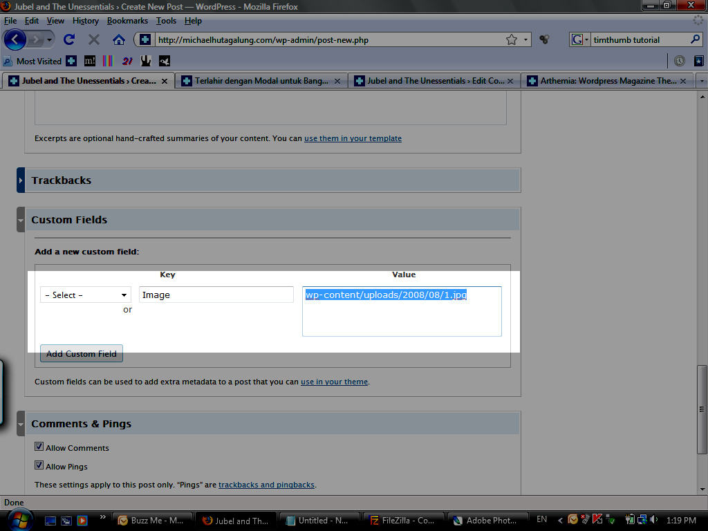 Then, close the image uploading page and you do not need to clik ‘Insert to Post’ button if you do not want to. When you’re back in the post editing page, scroll down until you find “Custom Fields”. Make a new Custom Field with “Image” as the key and the image location as the “Value”.