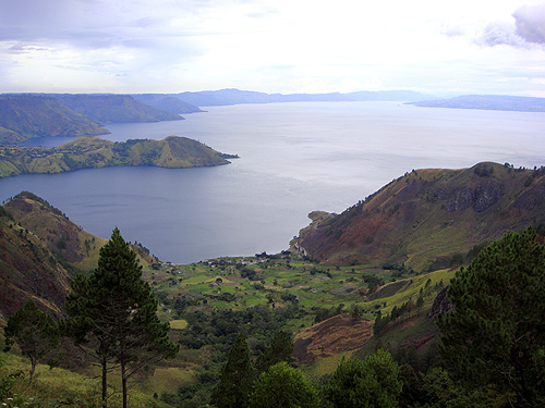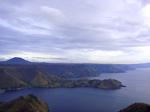 Lake Toba is a lake and supervolcano, 100 kilometres long and 30 kilometres wide, and 505 metres (1,666 ft) at its deepest point. Located in the middle of the northern part of the Indonesian island of Sumatra with a surface elevation of about 900 metres (2,953 ft), it is the largest volcanic lake in the world. In addition, it is the site of a supervolcanic eruption that occurred 74,000 years ago, a massive climate-changing event.